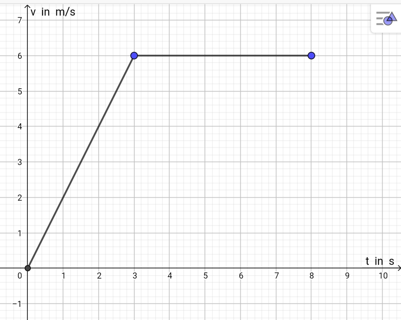 Ein Auto beschleunigt 3 Sekunden mit einer konstanten Beschleunigung von 2m/s2. Danach fährt es 5 Sekunden mit dieser Geschwindigkeit weiter. Zeichnen Sie das t-v und t-s-Diagramm dieser Bewegung.